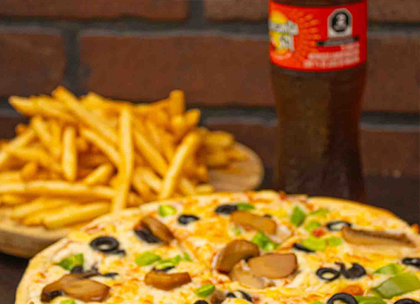 1 Pizza Mediana + Papas a la Francesa (150gr) + 2 Refrescos de 355ml.